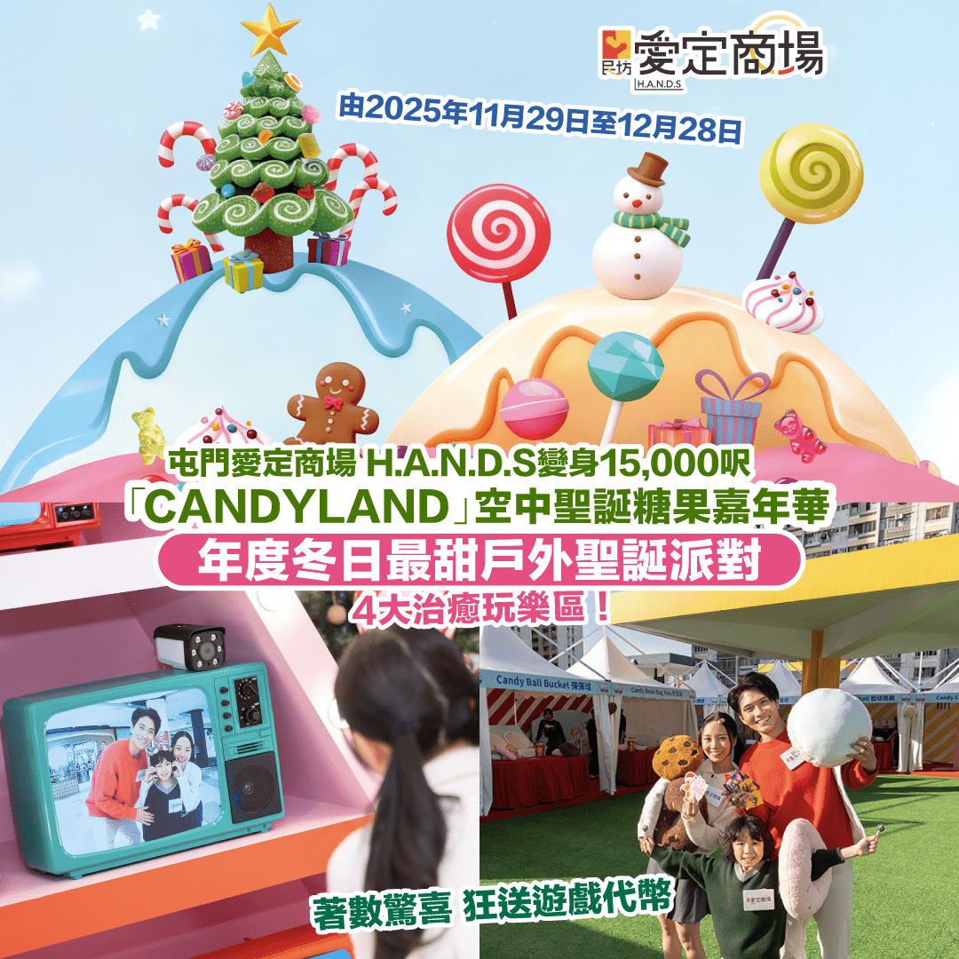 【🍭假日身心放鬆好去處!屯門愛定商場 H.A.N.D.S變身15,000呎「CANDYLAND」空中聖誕糖果嘉年華🍬】年度屯門區冬日最甜戶外聖誕派對!!4大治癒玩樂區!