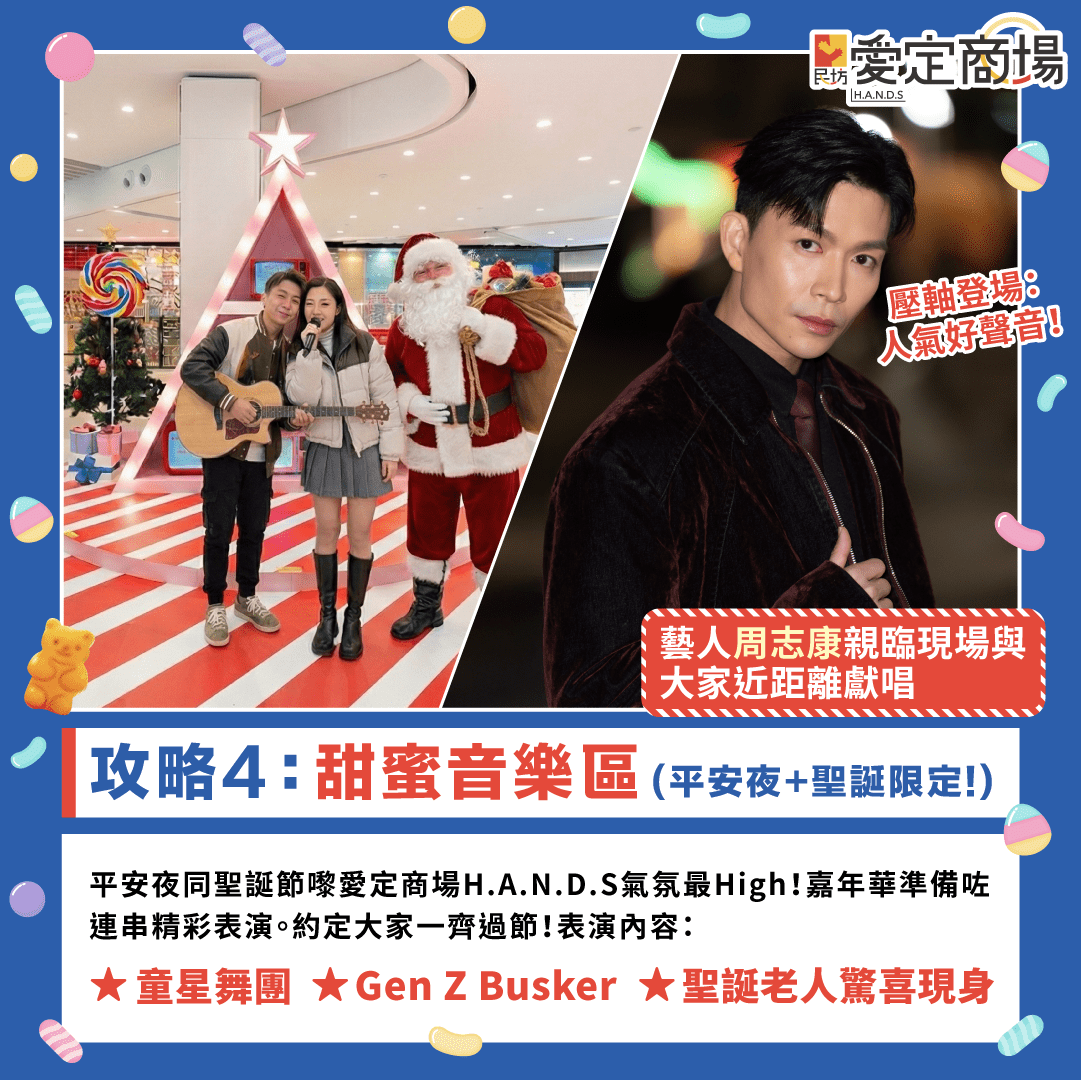 聖誕表演 (12月24日至25日限定) 平安夜聖誕壓軸登場!有藝人周志康親臨現場同大家近距離獻唱、童星舞團可愛登場、Gen Z Busker街頭表演等齊聚CANDYLAND🎶~仲有聖誕老人大派禮物🎅🏻同大家溫馨過節!